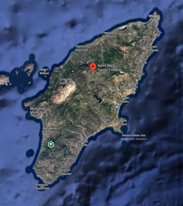 Εναλλακτικά, από τη δυτική πλευρά του νησιού, με διαδρομή που διαρκεί περίπου μία ώρα, μέσω της επαρχιακής οδού Ιαλυσού – Κατταβιάς, στρίβοντας στη Σορωνή αριστερά στην επαρχιακή οδό Ελεούσας και φτάνοντας στην Ελεούσα, δεξιά στην επαρχιακή οδό Παστίδας – Μεσαναγρού.